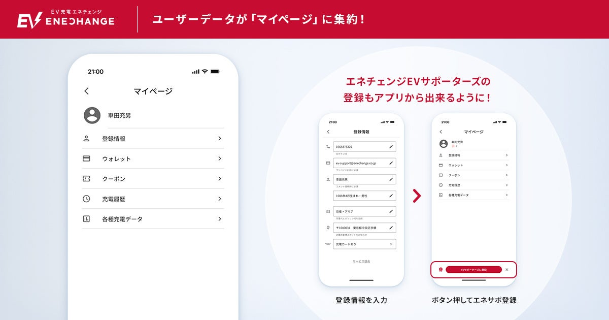 また、「エネチェンジEVサポーターズ」の参加登録がマイページから行えるようになりました。「エネチェンジEVサポーターズ」は、ユーザーに充電スポットの情報を提供してもらうことで、安心して利用できる充電インフラ環境づくりを推進するユーザー参加型のプログラムです。2023年12月6日の募集開始からこれまで約1,200人が参加登録し、充電スポットに関する写真や口コミを約2,300件投稿いただいています。この度のマイページ機能追加により、サポーターズ加入者は獲得ポイント数がマイページに表示されるようになりました。
