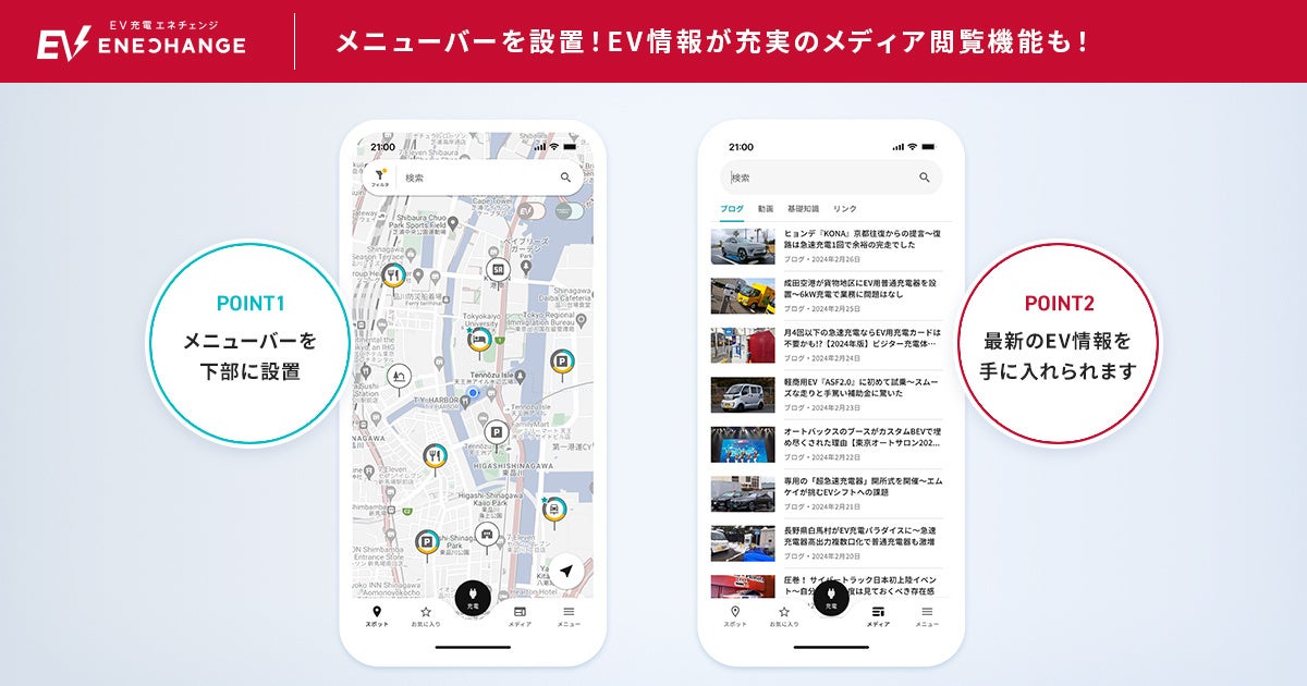 自動車ジャーナリストやプロのライターの記事が毎日更新される「EVsmartブログ」、ロングドライブ試乗やEVライフに役立つ情報を動画で発信するYouTubeチャンネル「EVsmart」、EV充電エネチェンジによるEV・充電の「基礎知識」をアプリ内からご覧いただけるようになりました。EVやEV充電に関する情報収集にお役立てください。