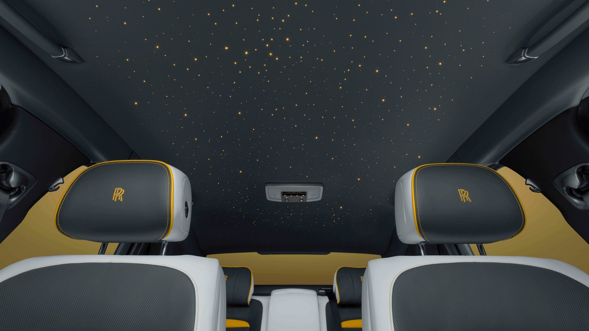 お客様は、ご自身が選択したエクステリア・カラーを際立たせ、さらにこの現代的なデザイン・トレンドの要となる印象的なコントラストを生み出すための大胆なアクセントカラーとして、ターコイズ、マンダリン、フォージ・イエロー、フェニックス・レッドの4色から選択することができます。選択したアクセントカラーはバンパー下部のインサート、ブレーキキャリパー、コーチラインに配され、ゴーストに備わるメカニカル、エアロダイナミック、彫刻的な要素にわたり、控えめながらも一体感のある姿を描き出します。繊細な色彩の煌めきは、ビスポークのスターライト・ヘッドライナーで色とりどりに輝く1,040個の「星」といったインテリアにまで広がります。ひとつひとつレザー・キャンバス上に手作業で正確に印をつけ、パンチングを施し配された星は、キャビン全体を穏やかな光で包みます。