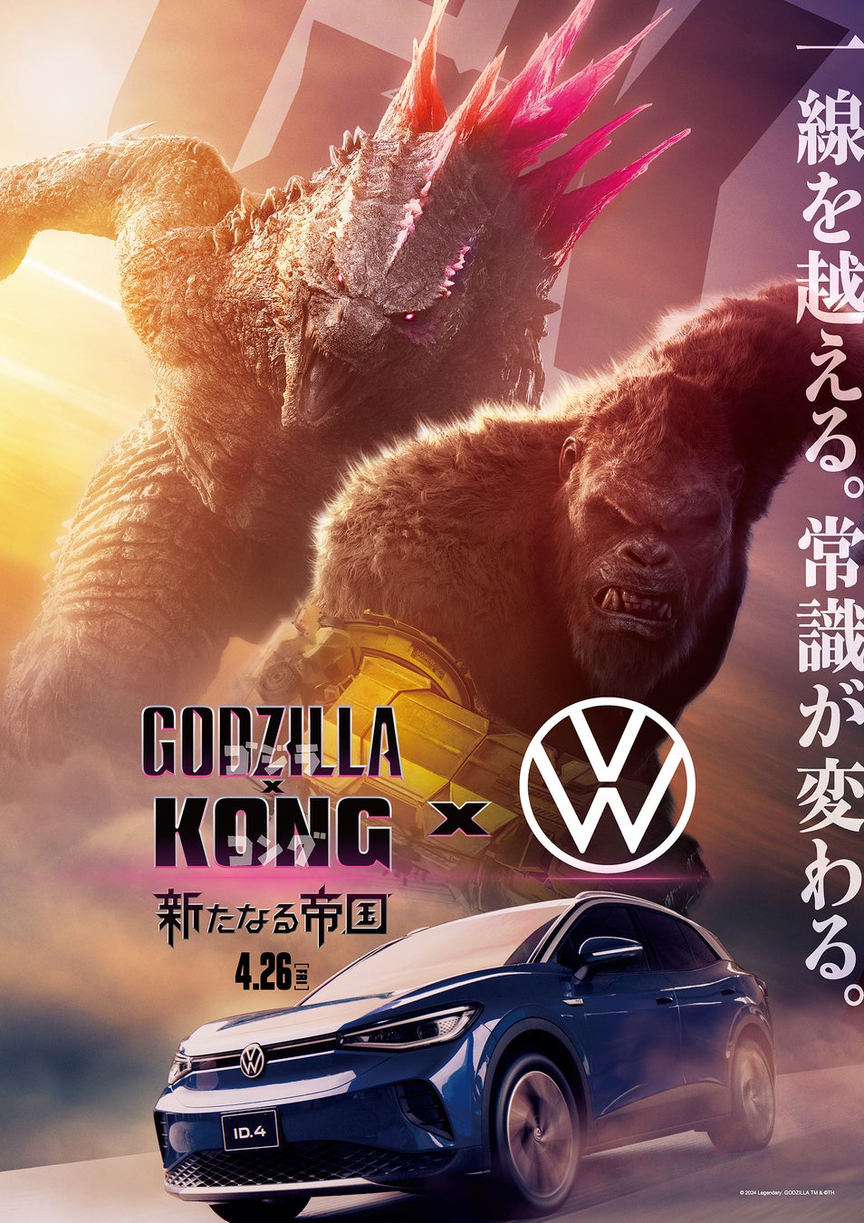 フォルクスワーゲン ジャパン(東京都品川区:ブランドディレクター アンドレア カルカーニ)は、本年4月26日(金)に公開予定のシリーズ最新映画『ゴジラ x コング 新たなる帝国』の劇中にフォルクスワーゲンのフル電動SUV「ID.4」が登場することを発表。上映される全国71劇場で本編制作チームが日本向けに制作したユーモラスな「ID.4」x「ゴジラ」x「コング」のショートムービーを公開します。