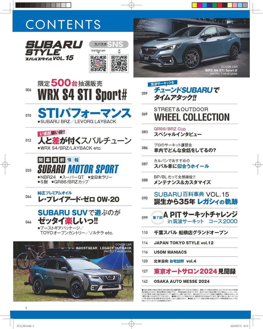 2024年もスバル車のカスタムシーンをさまざまな角度からお届けする「スバルスタイル」。最新号VOL.15では、東京オートサロン2024の会場を徹底リサーチ。スバル関係のカッコいいデモカーや気になるパーツをピックアップ。今シーズンの最新情報をチェックしよう。500台抽選販売、すでにオーダー終了となっていながらも注目度抜群の特別仕様車「WRX S4 STI Sport♯」もクローズアップ。SUVシーンで話題の「ブーストギア」も今年はアウトバックとフォレスターにて新提案。さらにモータースポーツ開幕直線情報はもちろんのこと、プロショップ&メーカーのサーキットタイムアタック。そしてユーザーカーの走行会なども掲載中。スバルカスタムの参考になるネタ満載なので、じっくり読んで、思い思いの愛車ライフを楽しもう!