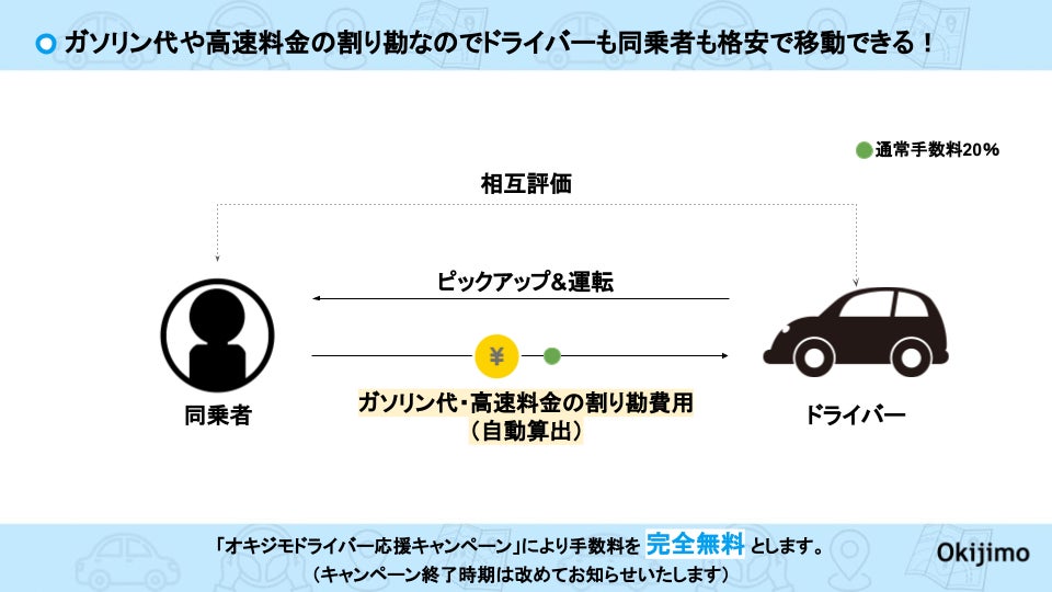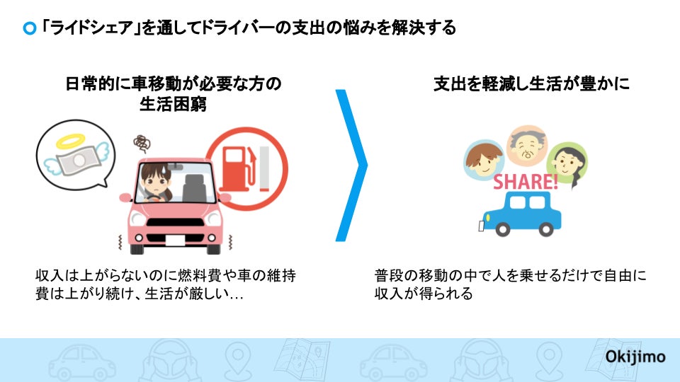県内ドライバー向けの交通情報サービスを10年間運営しており、常に県内ドライバーの皆さまと共に成長してきたオキジモだからこそ、この仕組みを率先して創るべきだと考えライドシェア事業への参入を決意いたしました。