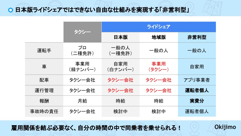 日本版ライドシェアや海外ライドシェアのような「営利型」ではなく、移動に伴うガソリン代や高速代をドライバーに渡す「非営利型」。