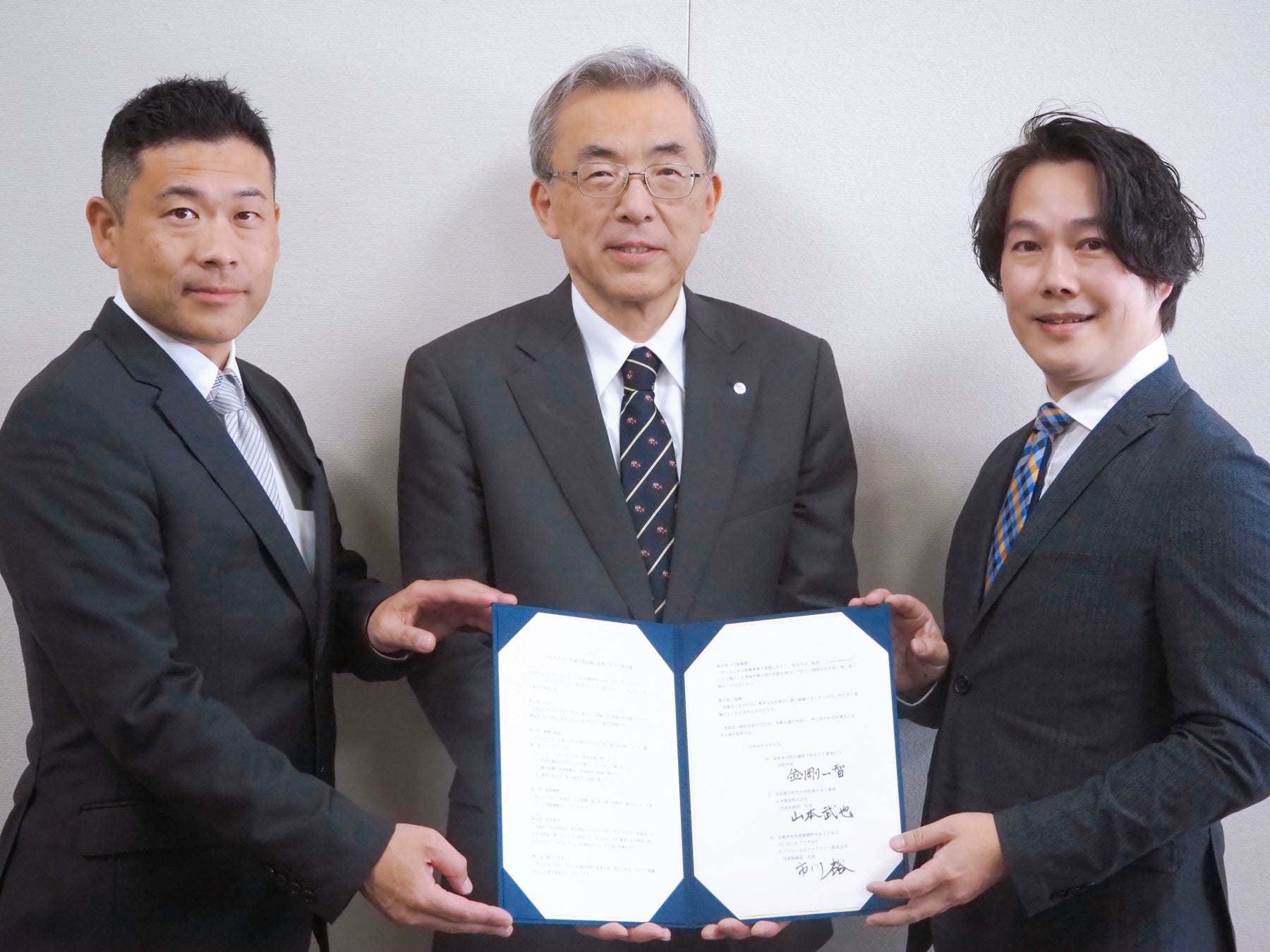 左から山本建設株式会社 代表取締役社長 山本 武也(やまもと たけや)、宇陀市市長 金剛 一智(こんごう かずとし)、テンフィールズファクトリー株式会社 代表取締役社長 市川 裕(いちかわ ひろし)