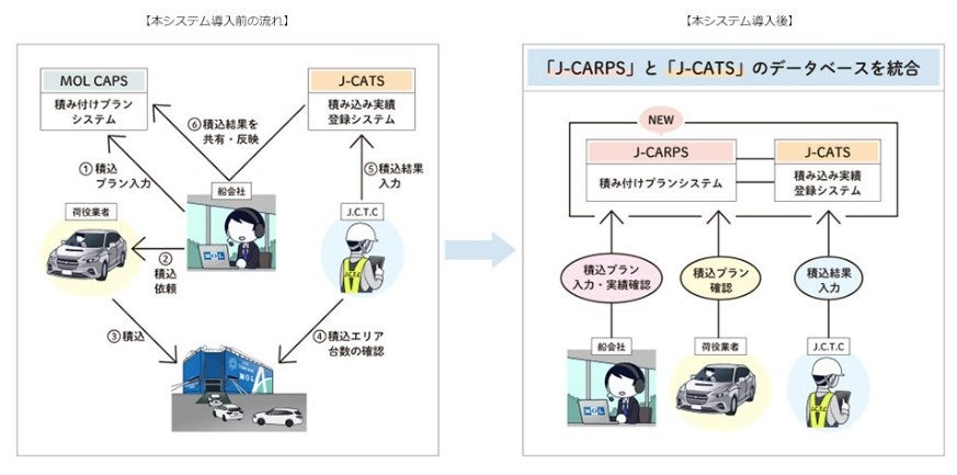 また、船会社とJ.C.T.Cが利用していたシステムおよびデータベースが異なっていたことで、船会社側ではJ.C.T.Cから受領する同社システムのフォーマットでの積み込み実績の図データを自社システムに転記する作業が発生しており、転記元と転記先のフォーマットが異なることから正確な追加積載可能台数を把握することが困難でしたが、データベースの統一化によりその誤差がなくなり、より多くの自動車を積み込めるようになります。