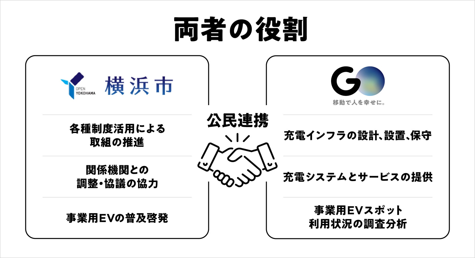 2050年までの脱炭素化「Zero Carbon Yokohama」の実現に向けた取組みを進める横浜市と、モビリティ領域の脱炭素化サービスを包括的に提供するGO株式会社(本社:東京都港区、代表取締役社長:中島 宏、以下当社)は、事業用車両のEV普及の促進に向け、「横浜市内の事業用EV普及促進に向けた連携協定」を締結しました。