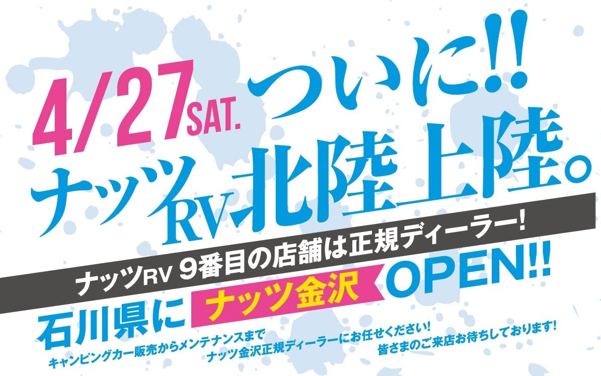 日本最大級のキャンピングカーメーカー ナッツRV初となる北陸店舗「ナッツ金沢」を4月27日(土)オープンいたします。