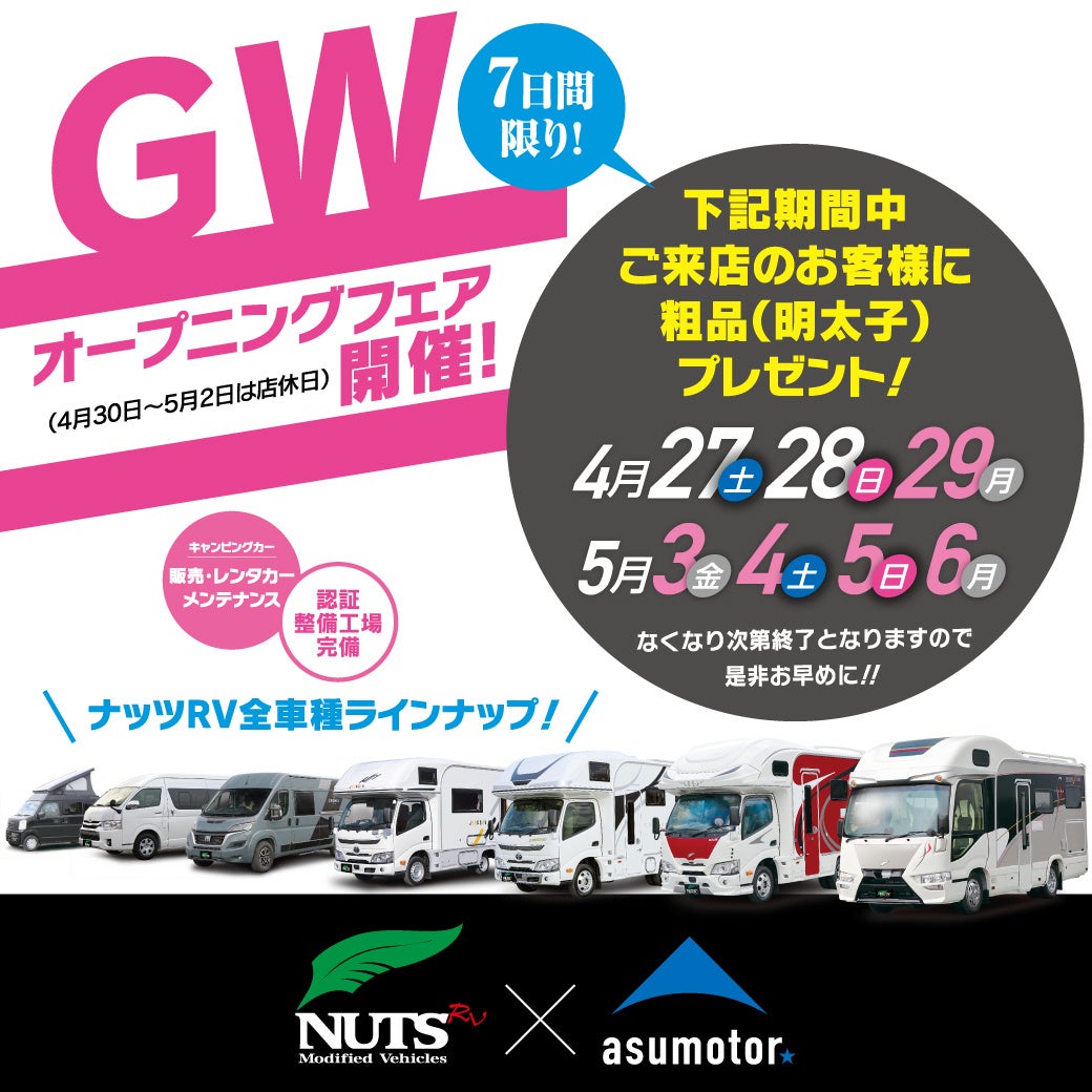 私たちアスモーターはキャンピングカーレンタルをスタートし、北陸のお客様にキャンピングカーの楽しさを知ってもらえるよう活動してきました。そして、この取り組みがきっかけでナッツRVと出会い、今日のご縁に繋がりました。