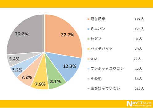 使用している車のボディタイプについては「軽自動車」がトップで27.7%となりました。次いで「ミニバン」で12.3%、「セダン」で8.1%と続きました。軽自動車は燃費が良く、維持費も安いため日本では人気のボディタイプとなっています。