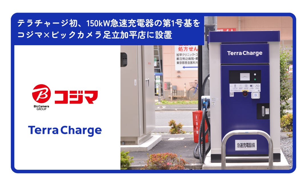 EV充電インフラ事業「Terra Charge(テラチャージ)」を展開するTerra Charge 株式会社(本社:東京都港区、代表取締役社長:徳重徹、以下「当社」)は、ビックカメラグループの株式会社コジマ(本社:栃木県宇都宮市 代表取締役社長 中澤裕二、以下「コジマ」)が運営するコジマ×ビックカメラ 足立加平店の駐車場に、Terra Charge初の、最大出力150kWのEV急速充電器1基(口)を設置し、6月3日(月)にサービスを開始したことをお知らせいたします。