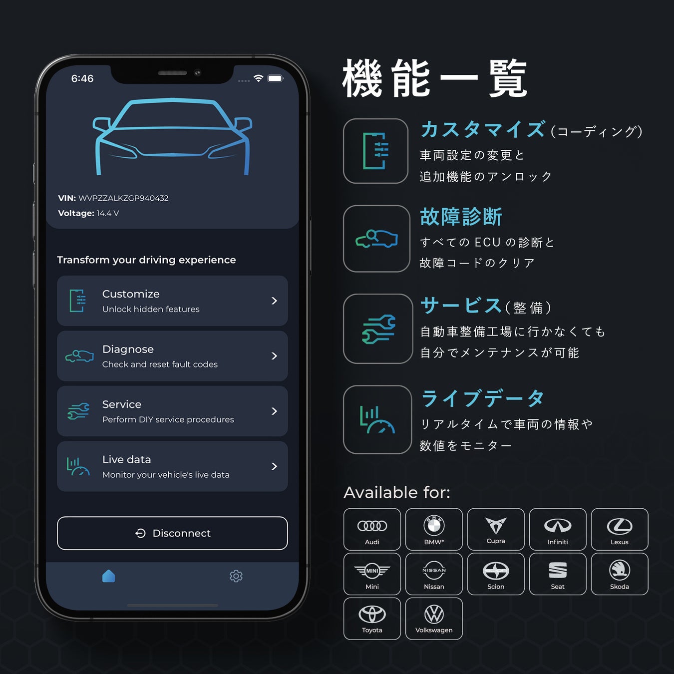 - VW(フォルクスワーゲン)、Audi(アウディ)、SEAT、Skoda、Nissan(日産)、Infiniti(インフィニティ)、Toyota(トヨタ)、Lexus(レクサス)、BMW、MINI(ミニ)に対応しています。