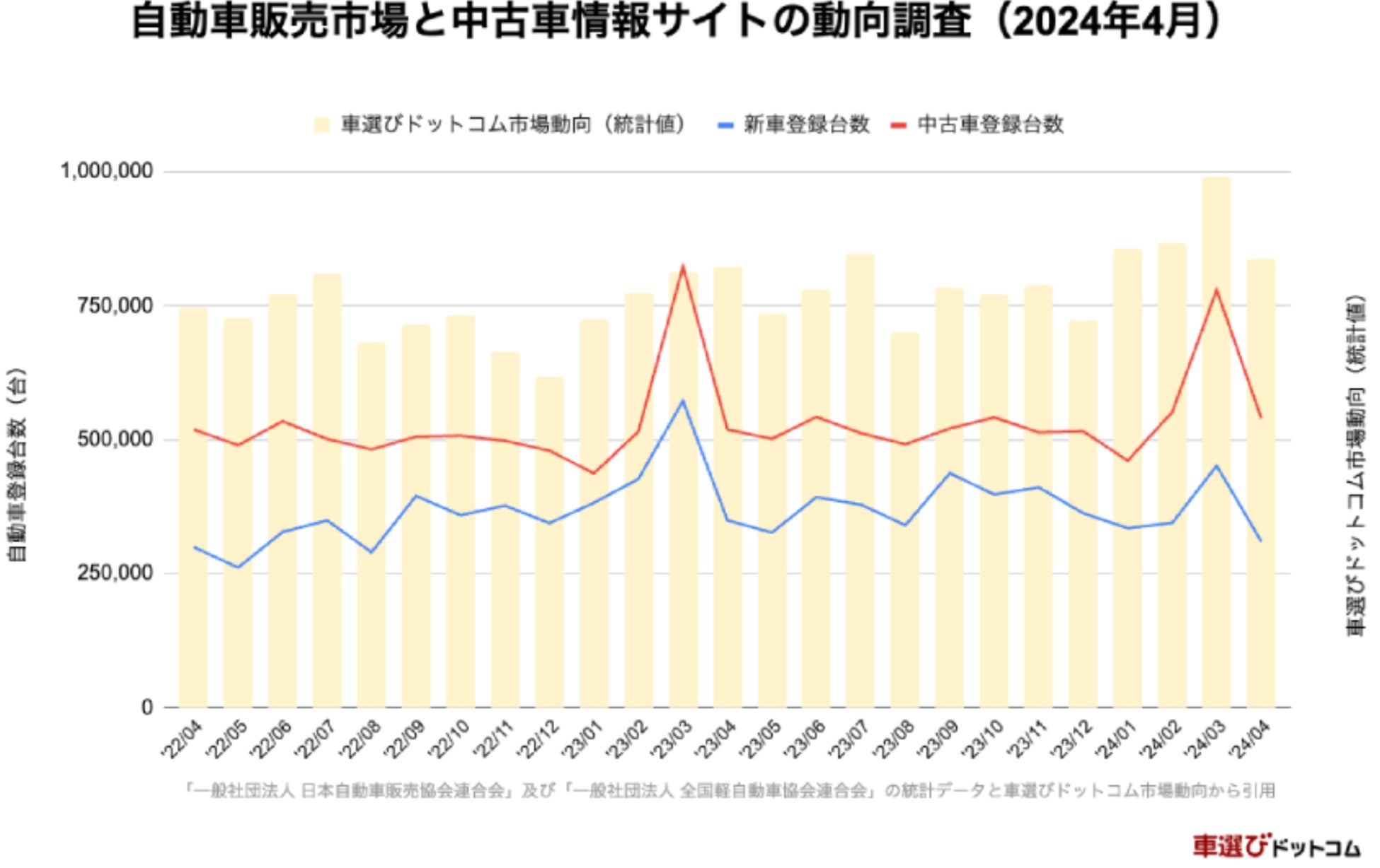 株式会社ファブリカホールディングス(本社:東京都港区、代表取締役社長CEO:谷口政人)の完全子会社、株式会社ファブリカコミュニケーションズ(本社所在地:愛知県名古屋市中区、代表取締役社⻑CEO:⾕⼝ 政⼈)が運営する中古⾞情報サイト「⾞選びドットコム(https://www.kurumaerabi.com/)」より、2024年4⽉における⾃動⾞登録台数の推移と、中古⾞情報サイト「⾞選びドットコム」の販売台数推移から、中古⾞市場の動きをまとめたレポートをご案内いたします。