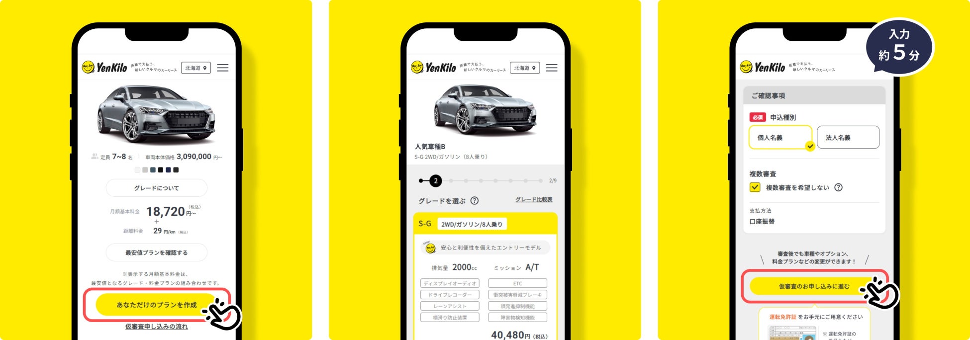 一方、細かいプランについては相談をしながら決めたいという方を対象に、3つのプランの中から1つを選んでお申し込みを行い、仮審査通過後に弊社カーライフプランナーと相談してプランを決定する「おすすめプラン」も設定しております。
