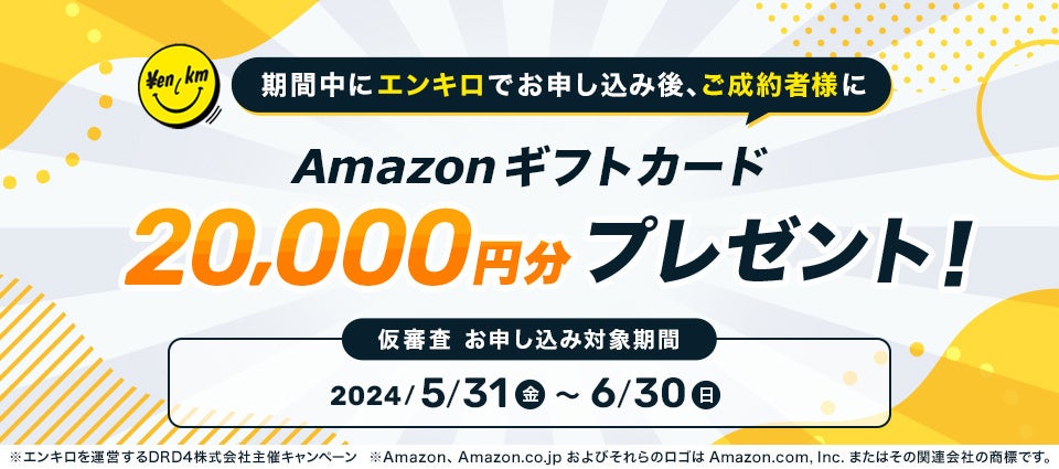 エンキロでは、サービスのリニューアルを記念して、本日から2024年6月30日(日)までに仮審査お申し込みをいただいた全てのご成約者様を対象としてAmazonギフトカード20,000円分をプレゼントする成約キャンペーンを実施いたします。マイカーを初めてご検討の方やお乗り換えをご検討の方は、この機会に是非エンキロをご検討ください。