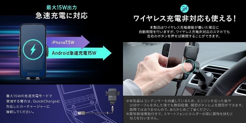 ワイヤレス充電対応のスマートフォンを設置すると、自動で充電位置に合わせてホルダーが動き、アームが閉めて、スマートフォンを固定します。異物検知機能付きで、スマートフォンとホルダーの間に異物を挟むと出力を行いません。ホルダー側面のボタンでもアームの開閉ができるので、ワイヤレス充電非対応のスマートフォンも固定できます。