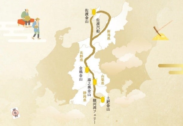 徳川直轄の金山であった「佐渡金山」(新潟県)と「土肥金山」(静岡県)は、家康公が開発に注力した金山であり、発掘された金は、江戸や大御所となった家康公が過ごした駿府に運ばれていました。長野県、山梨県にも金山があったことから、佐渡~土肥を結ぶ新潟~長野~山梨~静岡を繋いだルートを新たに「黄金KAIDO」と命名いたしました。この「黄金KAIDO」に、官民連携で一体的に国内外からの観光誘客を図る新たな取り組みです。