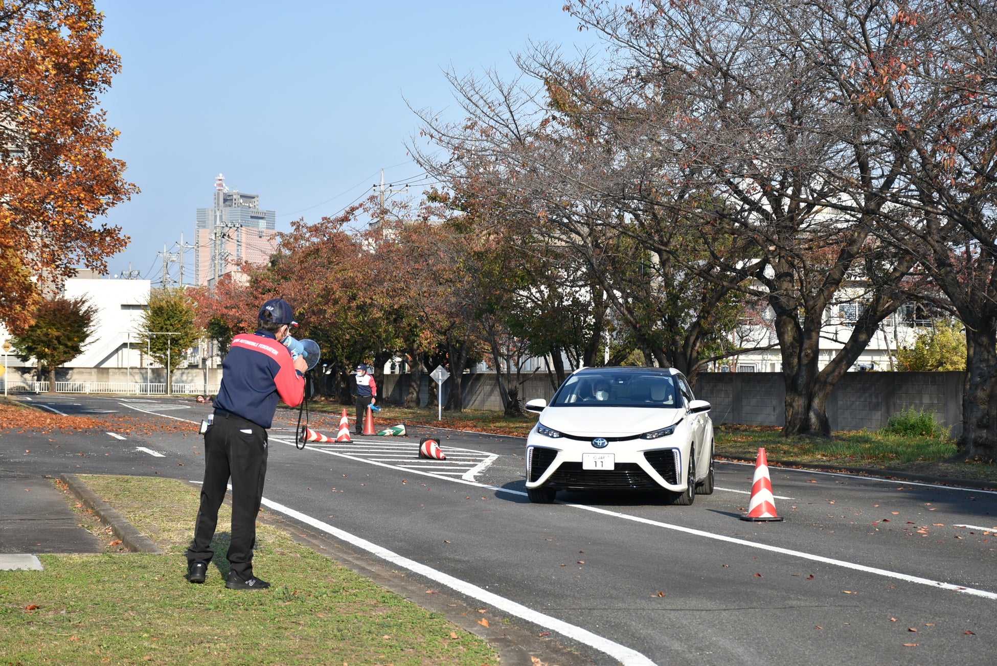 等間隔で一列に並べられたパイロン(三角コーン)の間を、「早く」「近く」「接触しない」でジグザグに走行します。ハンドルなどの運転操作や車の挙動を確認します。