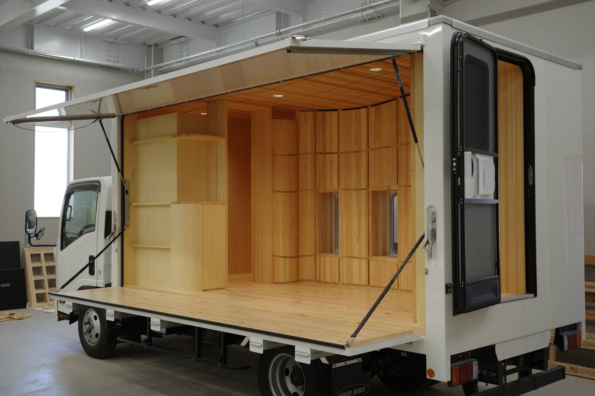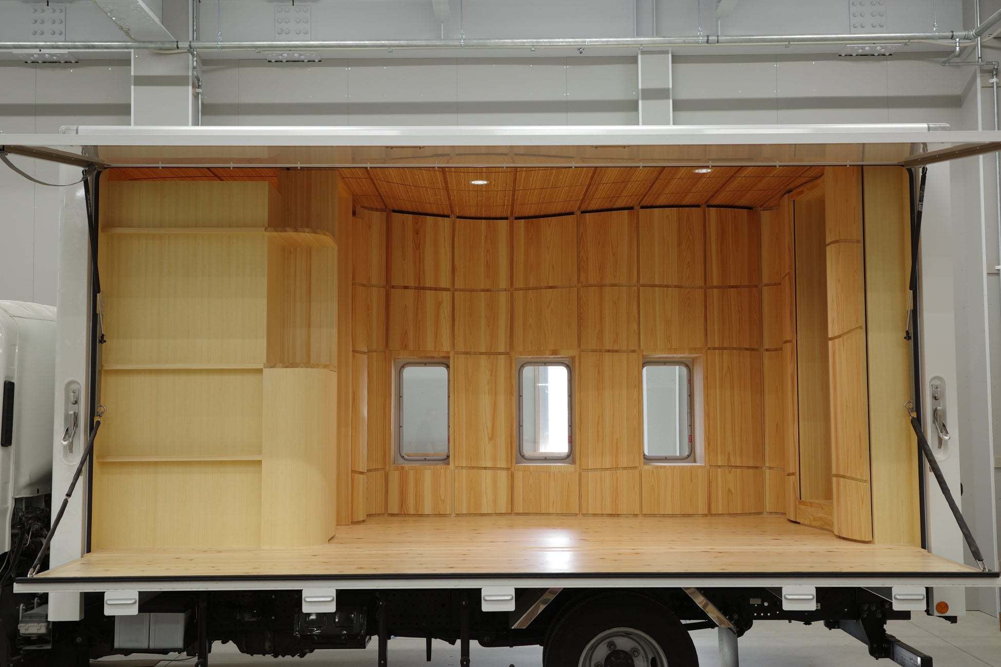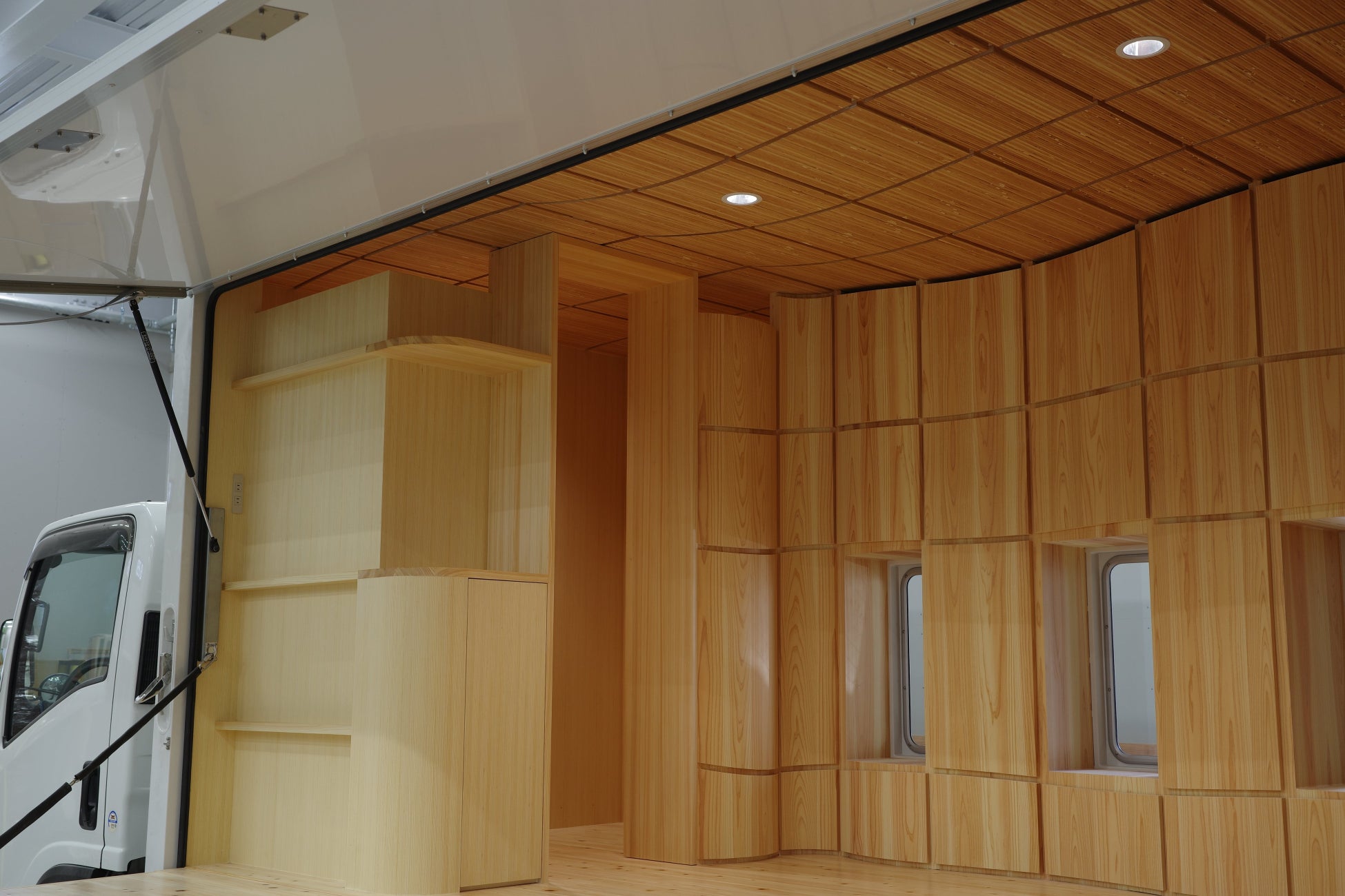 移動インフラとしてディーラー車検を獲得、庫内を木質化したトラックは、国内でも新しい試みとなります。