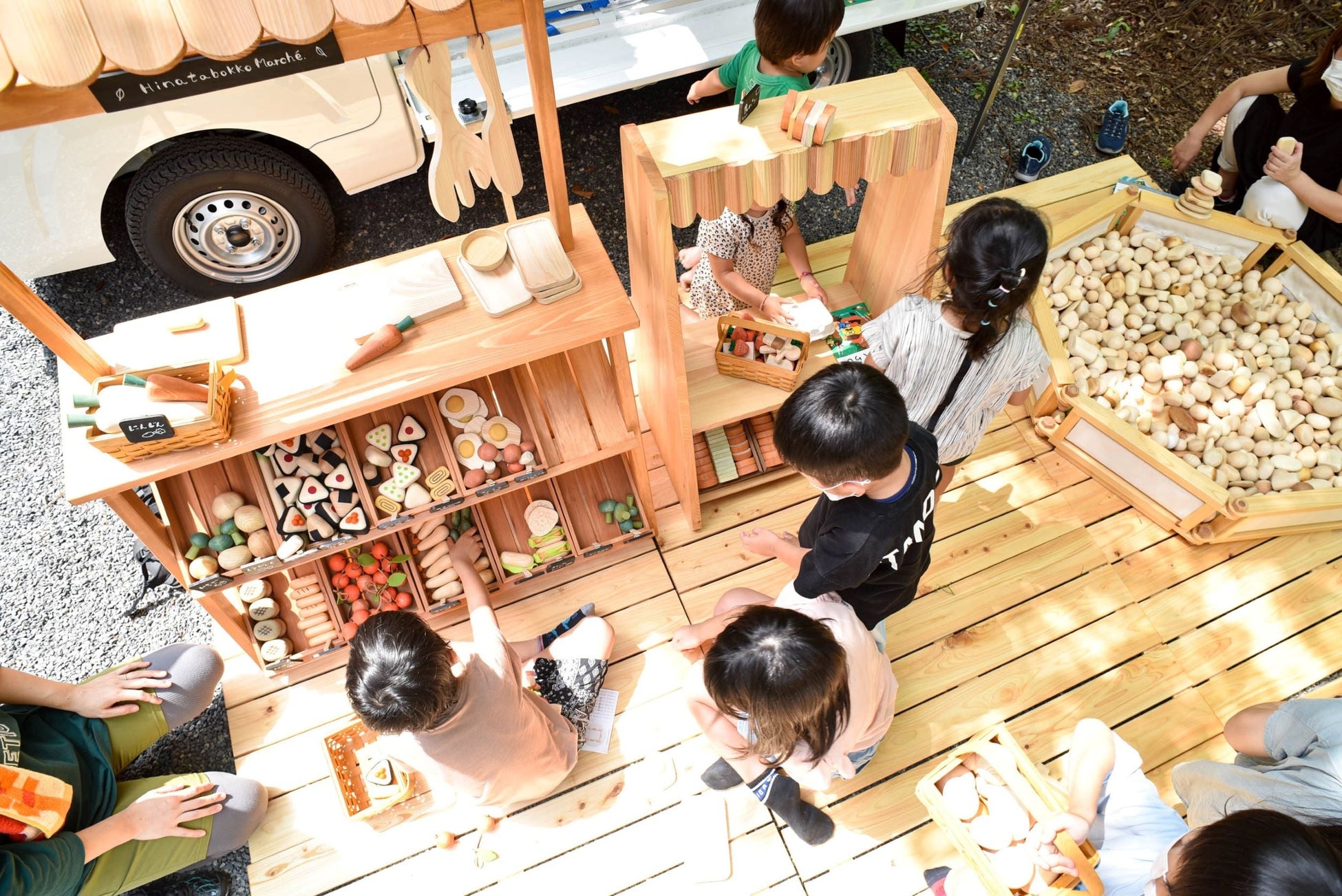 ❒木製おもちゃを搭載しており、どんな場所でもこの一台で遊び場を提供することができます。