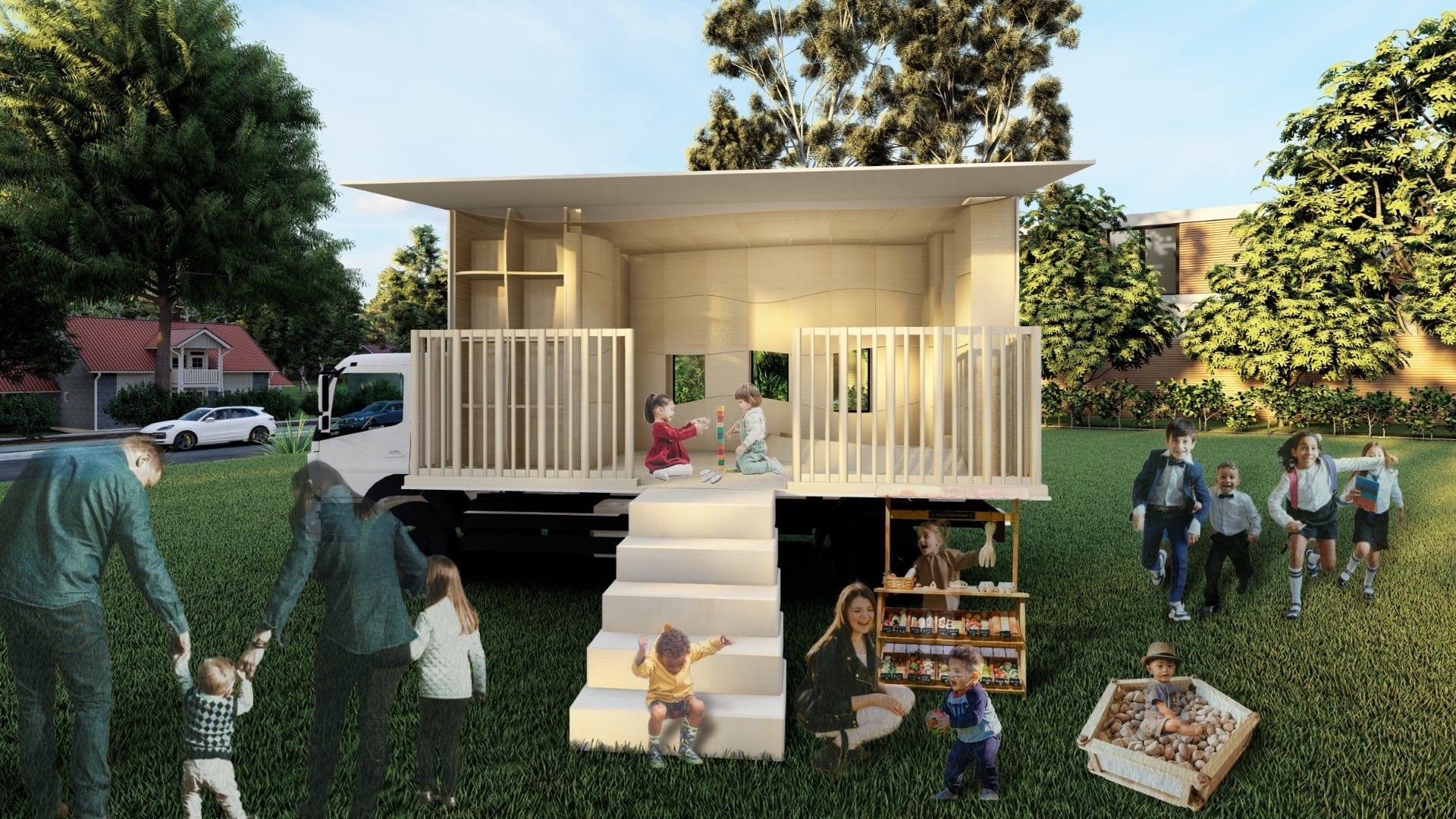 ▼木に触れながらサスティナブルな体験と学びを提供できる移動多機能保育室