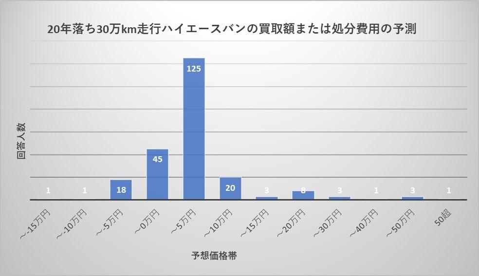 0~+5万円という結果が全回答の圧倒的多数(全体200人中、125人、62.5%)となっており、ほとんどの人が、20年落ち、30万㎞のハイエースバンは廃車であると認識している事が良く分かります。