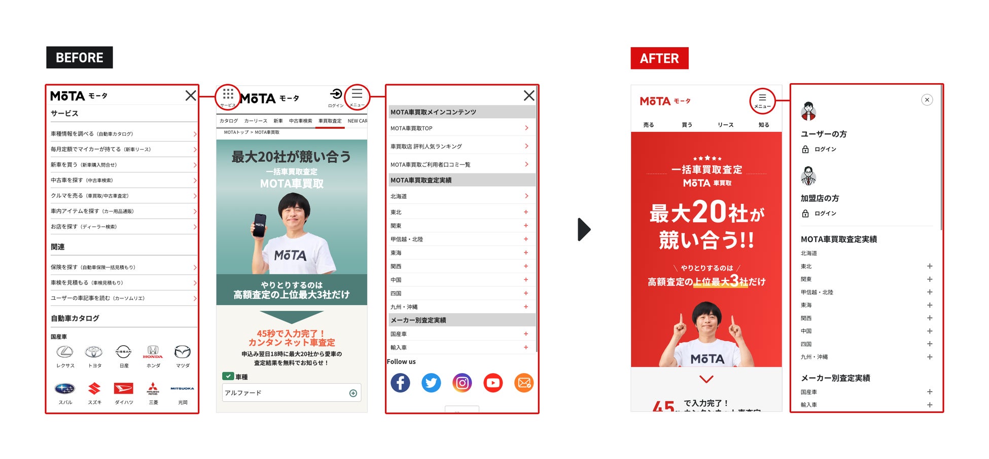 MOTAのブランドプライマリカラーであるレッドを基調としたデザインに変更し、ブランドイメージをより明確にしました。色数を減らし、シンプルで洗練されたデザインにすることで、ユーザーのストレスを軽減。サイト内に散らばっていた導線をまとめて分かりやすくし、目的の情報にたどり着きやすくしました。