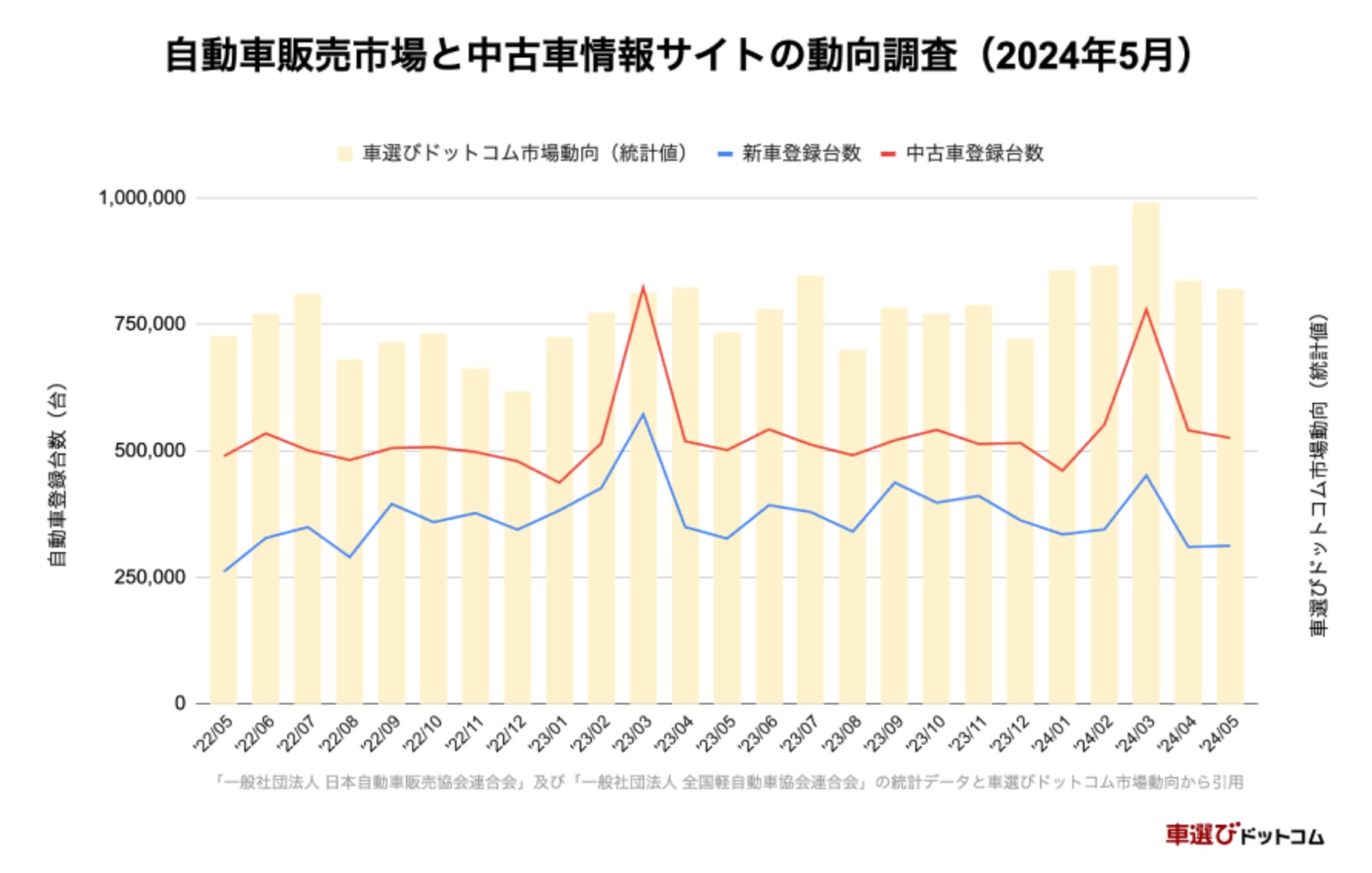 株式会社ファブリカホールディングス(本社:東京都港区、代表取締役社長CEO:谷口政人)の完全子会社、株式会社ファブリカコミュニケーションズ(本社所在地:愛知県名古屋市中区、代表取締役社⻑CEO:⾕⼝ 政⼈)が運営する中古⾞情報サイト「⾞選びドットコム(https://www.kurumaerabi.com/)」より、2024年5⽉における⾃動⾞登録台数の推移と、中古⾞情報サイト「⾞選びドットコム」の販売台数推移から、中古⾞市場の動きをまとめたレポートをご案内いたします。