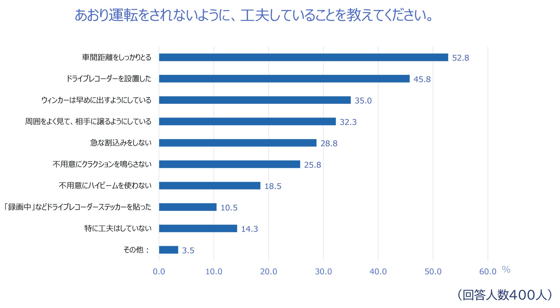 あおり運転を受けたことがあるドライバーに、あおり運転をされないように工夫していることを聞いたところ、「車間距離をしっかりとる(52.8%)」「ドライブレコーダーを設置した(45.8%)」と続き、周りのドライバーを刺激しない運転を心がけるとともに、ドライブレコーダーを設置することであおり運転をされないよう対策をとる人が目立ちました。