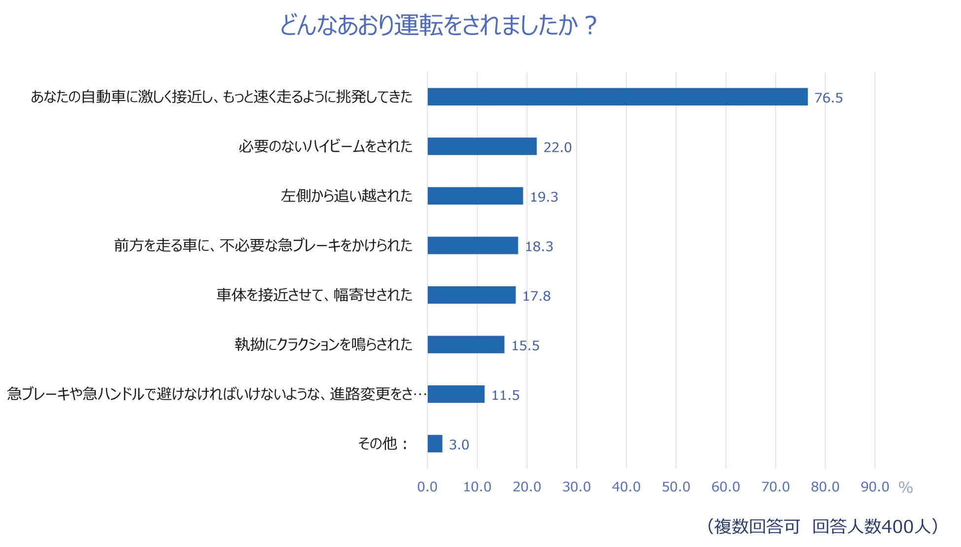今回の調査ではここ3年であおり運転を受けた経験を持つ回答者が45.4%にもなりました。半数近くの回答者があおり運転の被害を受けていることは、あおり運転をはじめとする妨害運転に対する厳罰化の効果が限定的であったことを示しています。特に注目したいのはこの半年の間にあおり運転を受けた回答者が24.1%もいることです。半年というまだ記憶に新しい期間でのこの数字は、現時点においてもあおり運転がまだ日常的に横行している状況を表しています。あおり運転を防止するための社会的な取り組みをさらに強力に実施する必要があると共に、ドライバー自身においてもあおり運転にあわないための工夫をしなければならないと考えられます。