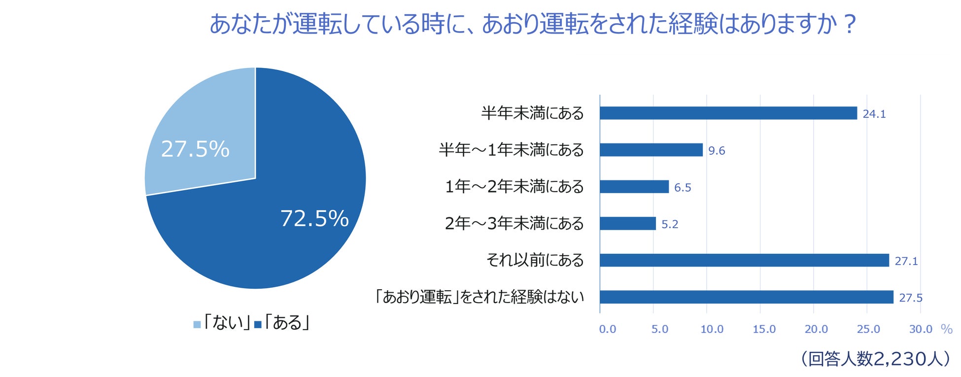 - 1. あおり運転をされた経験があるドライバーは72.5%と、昨年の53.5%から19ポイントの上昇。半年でも24.1%の結果に。