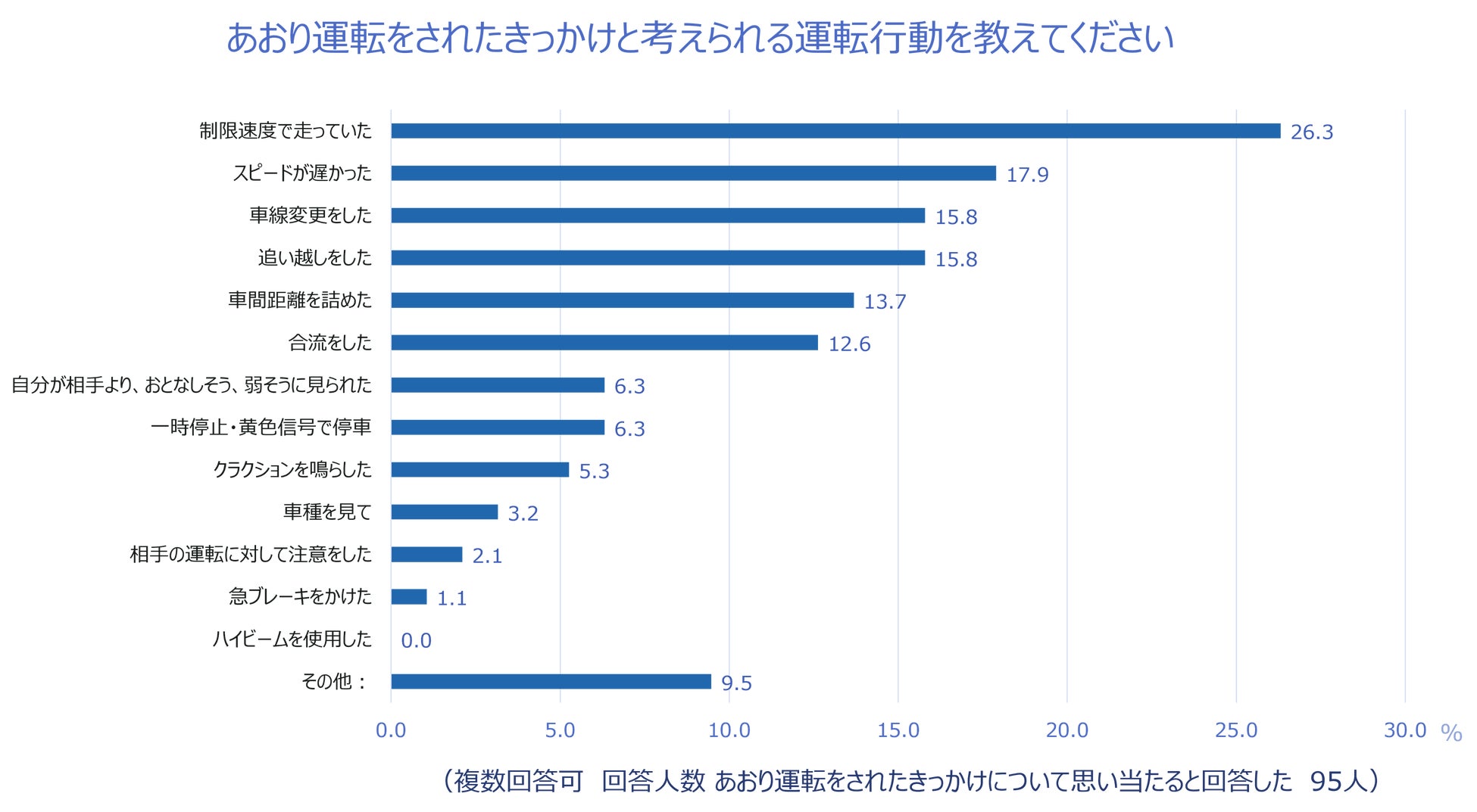 あおり運転をされたきっかけについて、思い当たることがない人が76.3%と、多くを占める結果となりました。「思い当たることがある」と答えた人にきっかけと考えられる運転行動を聞いたところ、「制限速度で走っていた(26.3%)」「スピードが遅かった(17.9%)」と続き、あおり運転のきっかけと考えられる行動は、運転速度に関するものが多い結果となりました。