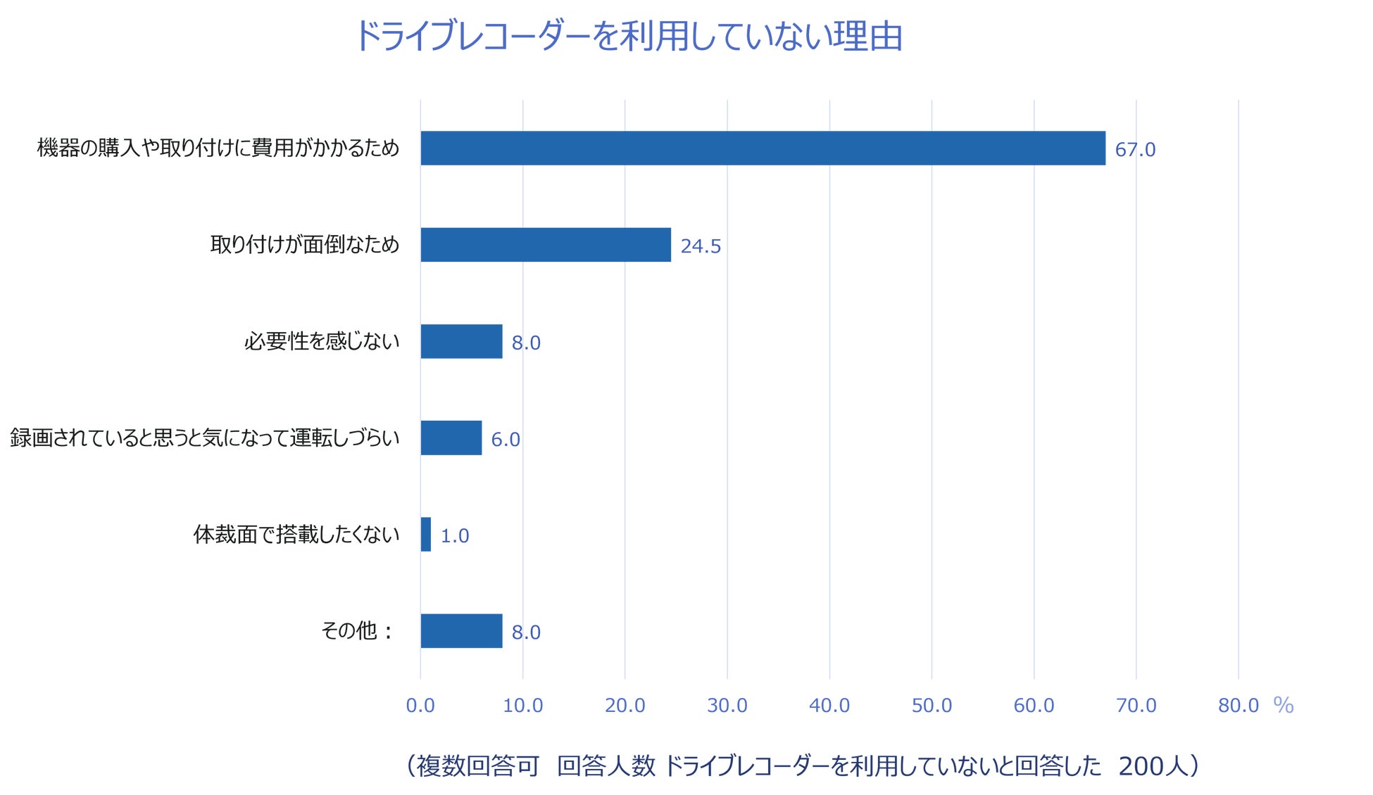 8.ドライブレコーダーを利用していない理由としては、「機器の購入や取り付けに費用がかかるため(67%)」が最多。