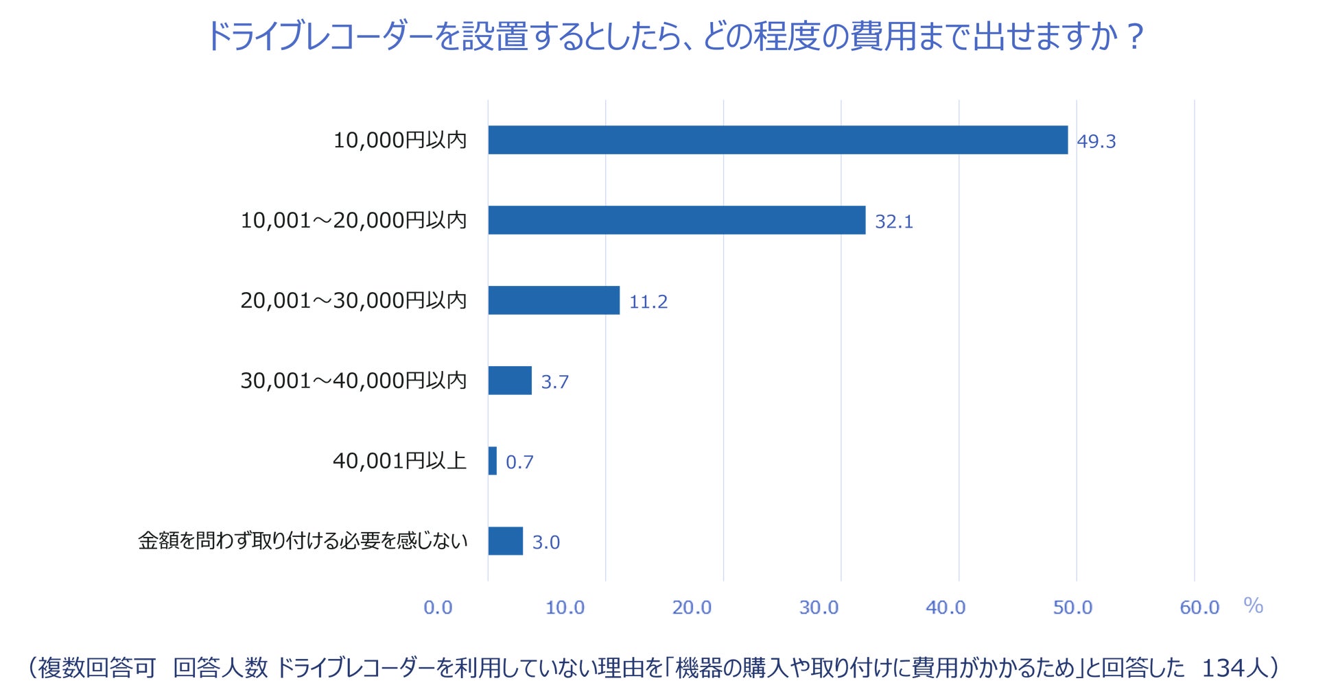ドライブレコーダーを利用していないドライバーを対象に、その理由を聞いたところ、「機器の購入や取り付けに費用がかかるため」が67%で最も多くなりました。また、「ドライブレコーダーを設置するとしたら、どの程度の費用まで出せると思いますか?」との問いには、10,000円以内が49.3%、20,000円以内が32.1%と回答しました。なお、「金額を問わず取り付ける必要を感じない」人は3%と少ない結果となりました。