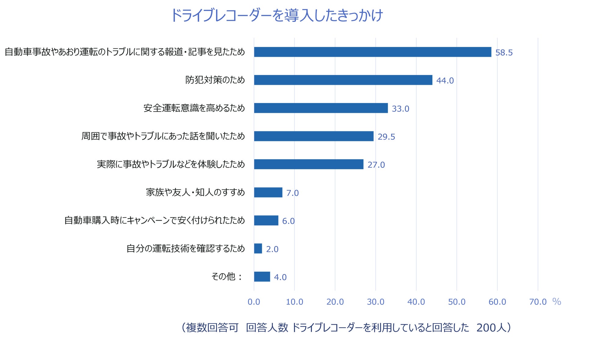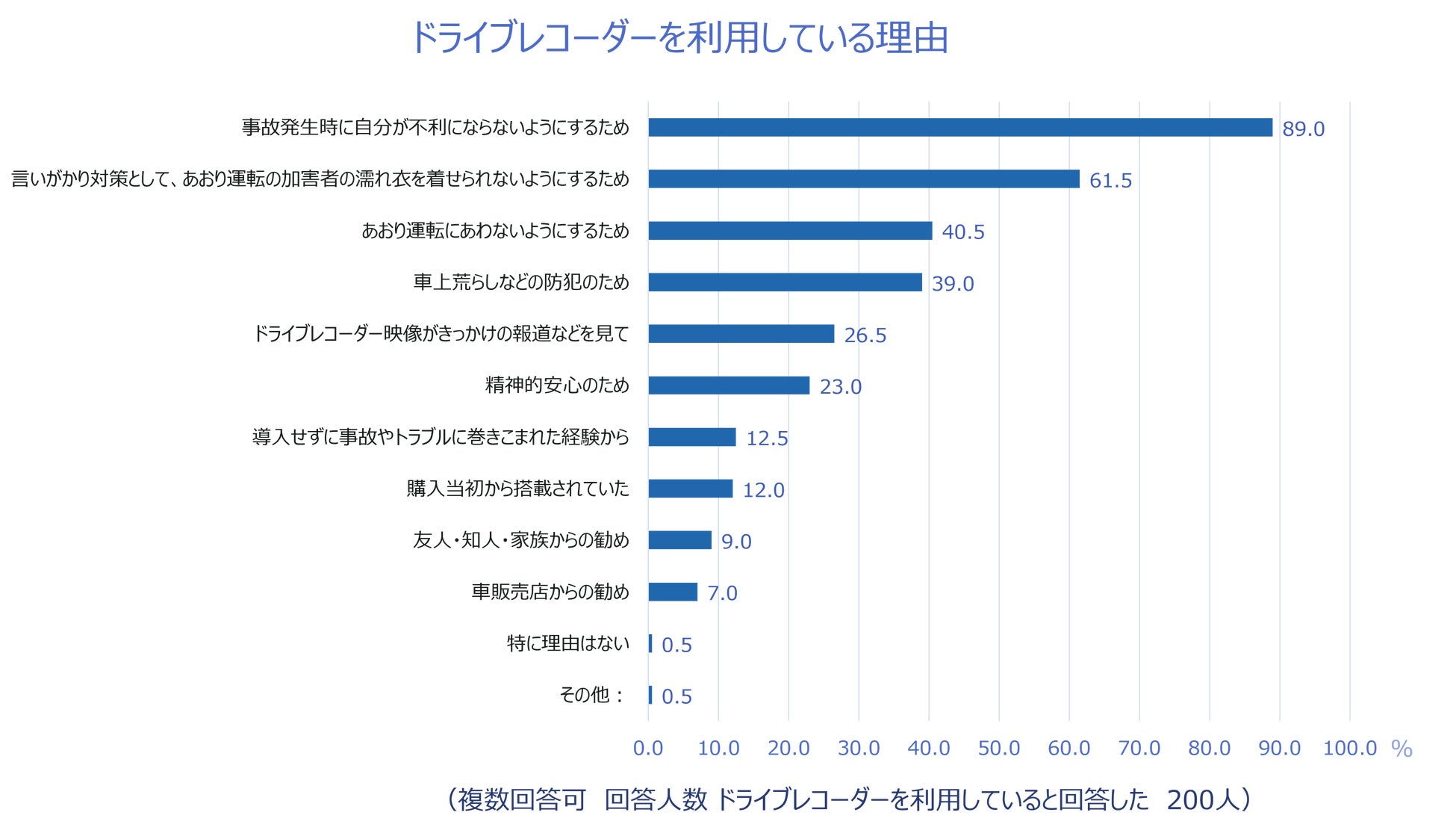 - 7. 現在ドライブレコーダーを利用している理由は「事故発生時に自分が不利にならないようにするため」が89%と過去最高値の結果に。加えて、現在使用しているドライブレコーダーの導入のきっかけは、「自動車事故やあおり運転のトラブルに関する報道・記事を見たため(58.5%)」「防犯対策のため(44%)」「安全運転意識を高めるため(33%)」と続く。