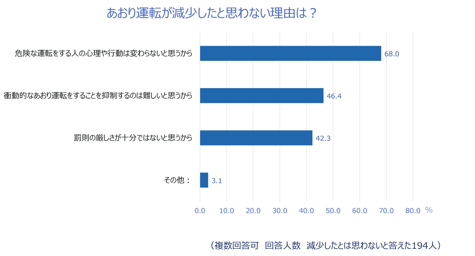 悪質なあおり運転に起因する事件、事故が多発し、あおり運転に対する問題意識が高まっています。2020年6月には、あおり運転の厳罰化を盛り込んだ「改正道路交通法」が施行されました。この法改正によりあおり運転が減少したと思うかとの問いでは、「減少したと思う」と回答したドライバーは51.5%となりました。また、「減少したとは思わない」と回答した人は、理由として「危険な運転をする人の心理や行動は変わらないと思うから(68%)」が最も多く、前年と同様の結果となりました。