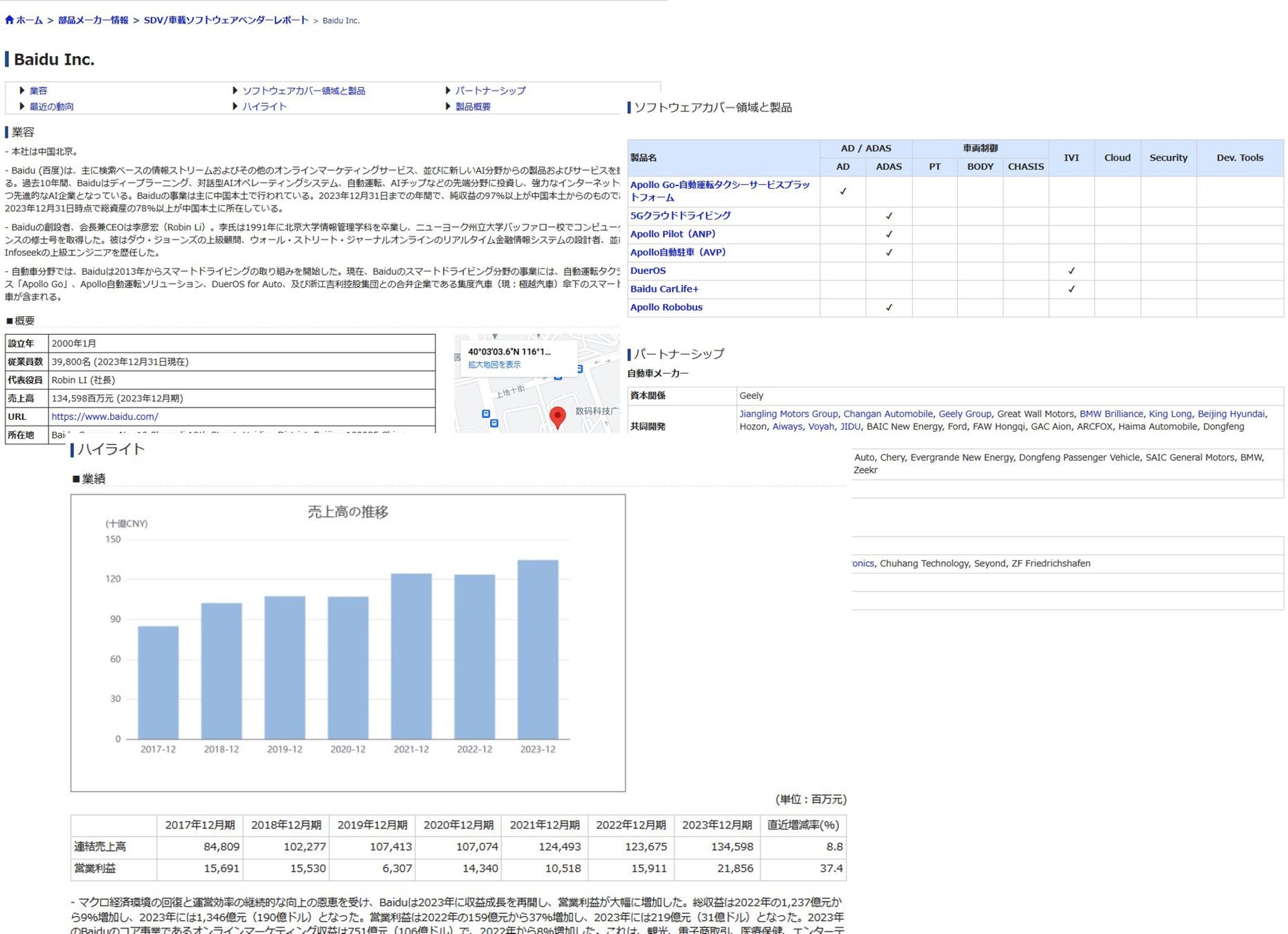 ハードウェアからAI、ソフトウェア主導への移行が叫ばれる自動車業界で、SDVへの取り組みが注目されています。自動車業界のソフトウェアベンダーとして注目される23社について、当該企業の概要、製品(サービス)、パートナーシップ、最近の動向、売上などの情報をわかりやすくまとめたレポートをご覧いただけます。