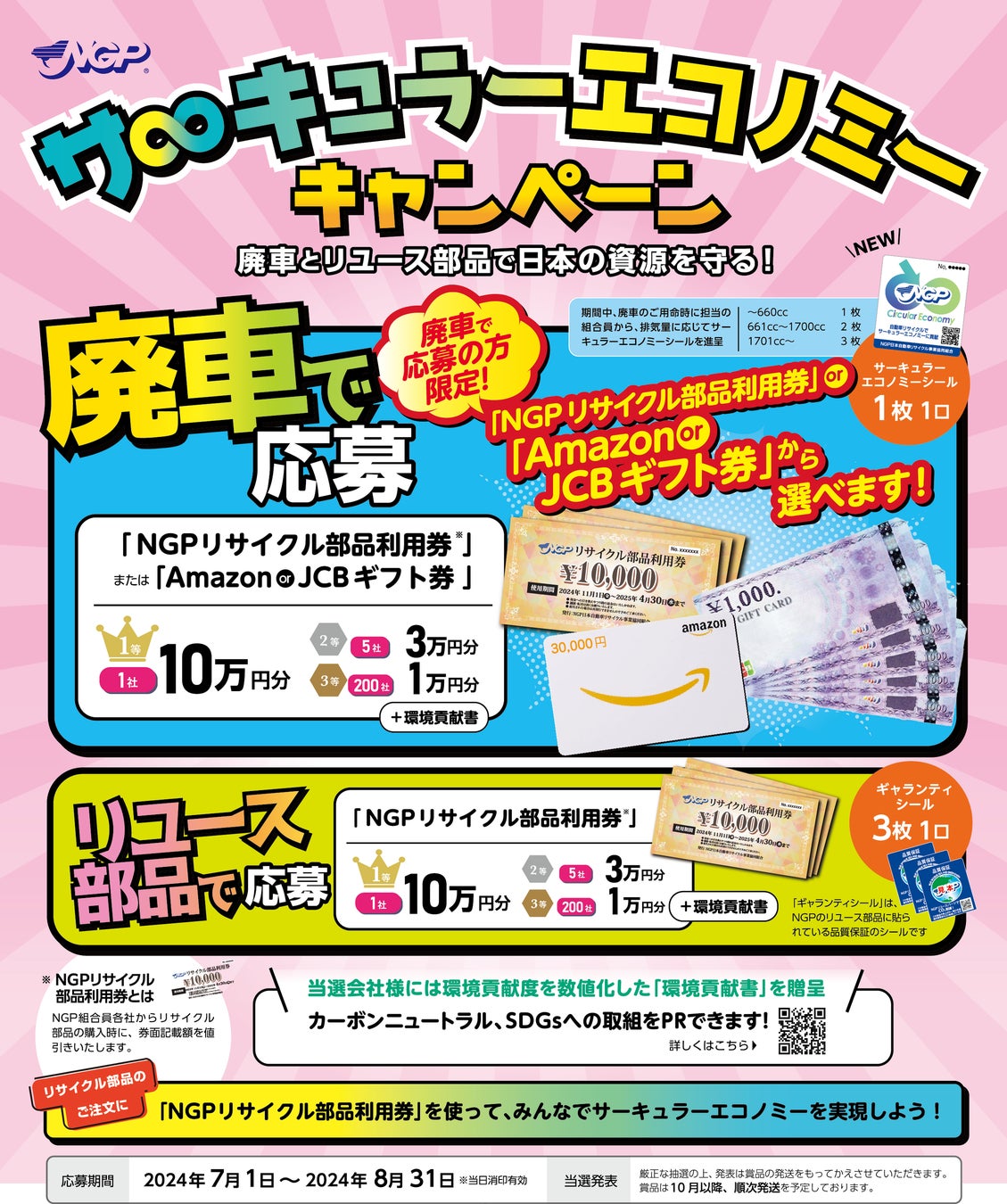 キャンペーンは、廃車の提供やリサイクル部品の利用に応じて応募できるものとしており、NGPの組合員に車両を提供していただくことで、リサイクル部品と鉄・銅・アルミ・プラスチックなどの資源が国内で循環し、サーキュラーエコノミーにも貢献できるという新たな価値の提供や、環境にやさしいNGPリサイクル部品をこれまで以上に訴求するために、賞品に「NGPリサイクル部品利用券」を設定いたしました。
