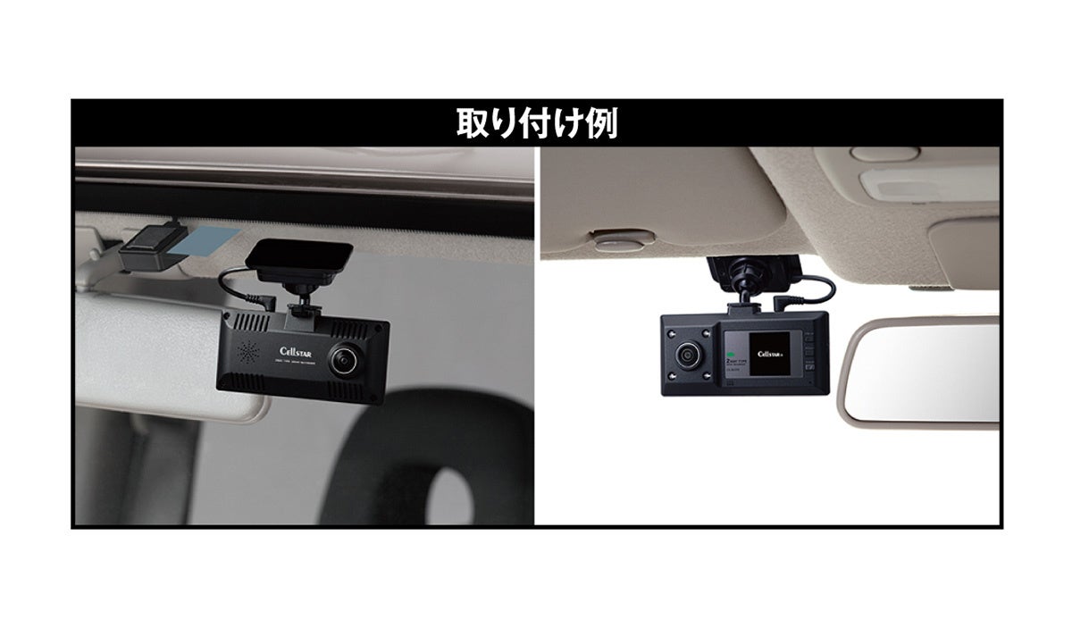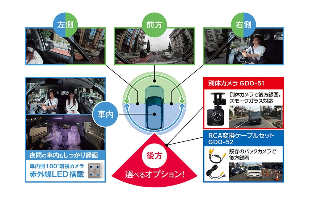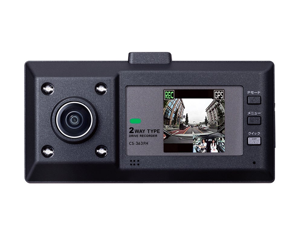前方側180度・車内側180度の2カメラによる360度録画が可能で、リヤカメラをオプションの別体カメラだけでなく既存のバックカメラも利用できるドライブレコーダー「CS-363FH」