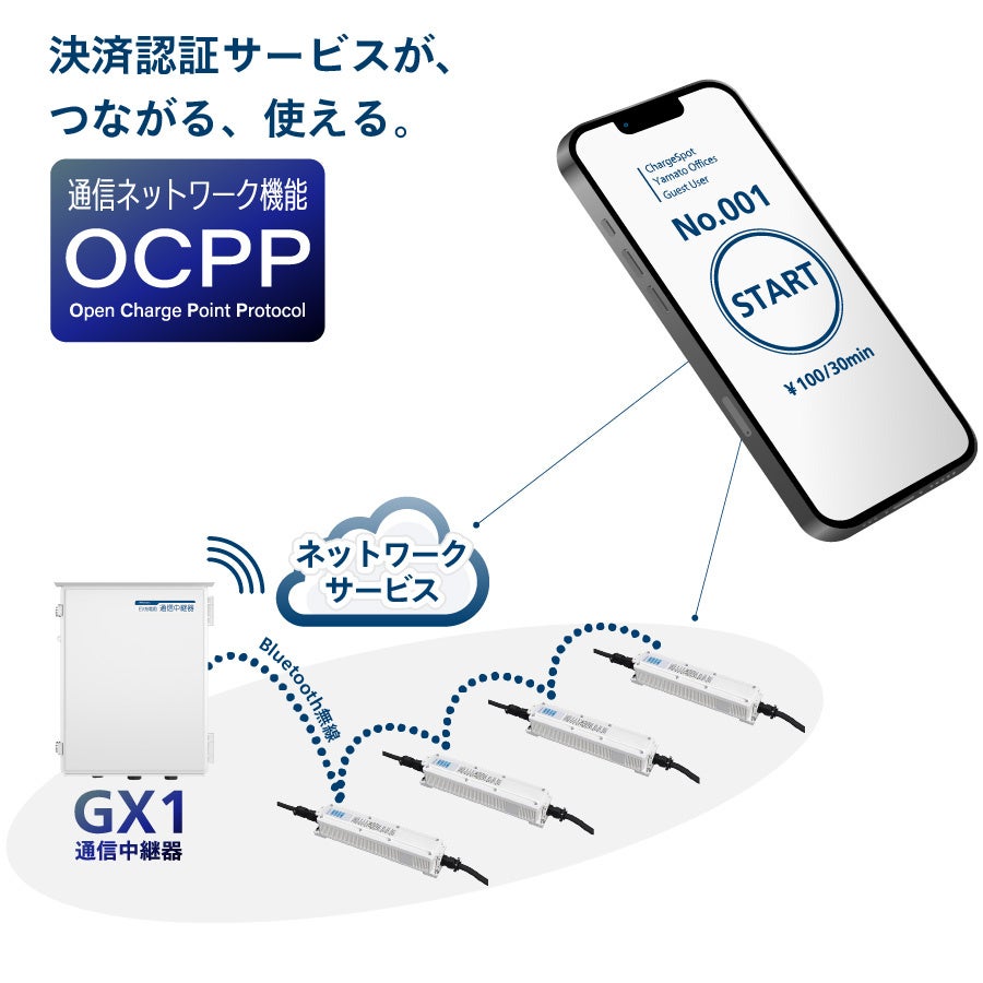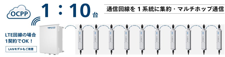最大10基のEV充電器を1回線でクラウドサーバーに接続する「通信中継器GX1」が新登場。LTEモバイル通信モデルなら完全ワイヤレス通信で省資源エコシステムに。「見せないシリーズ」は外観アレンジも自由。