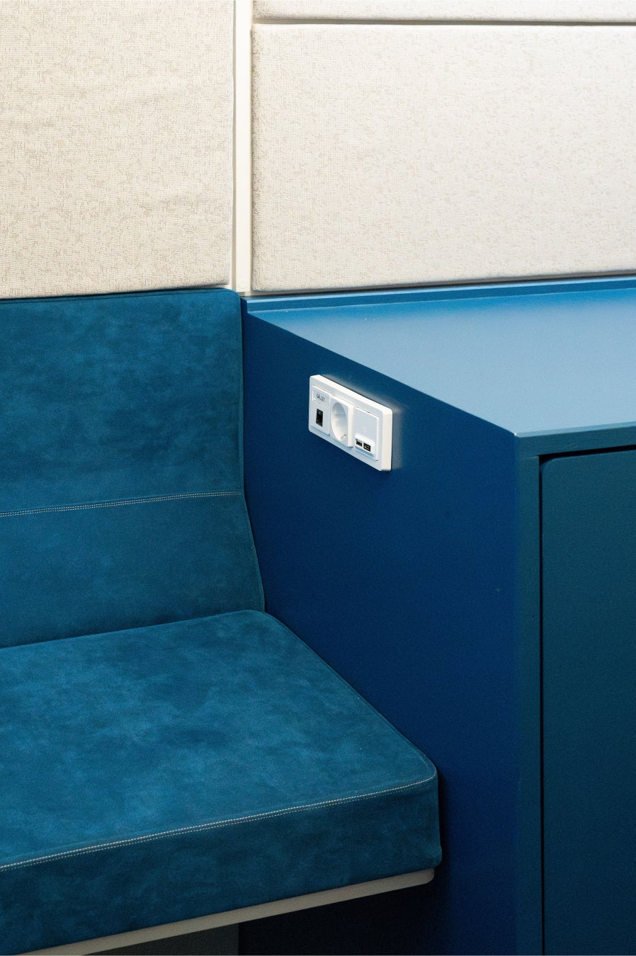 ギャレーには、空間を彩るため、ALCANTARA®のボヘミアントーンで彩られたパッド入りベンチが設置されています。