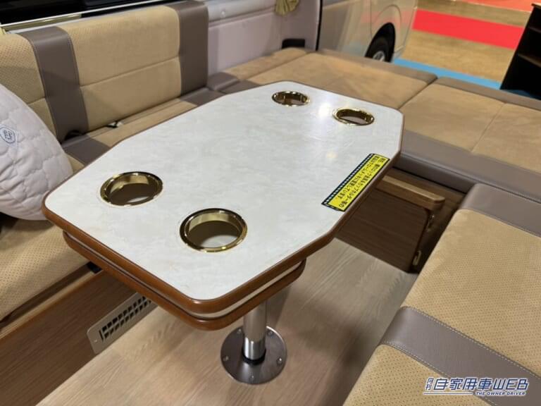 ドリンクホルダーを備えたテーブルは、使いやすくも邪魔にならない適度なサイズ感。