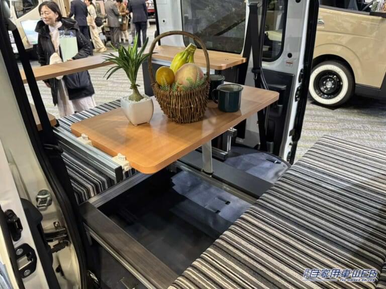 フラットスペースに座れば、司法をテーブルに囲まれる形となる。また、後部の横長のテーブルは車外にいる場合でも使いやすい。